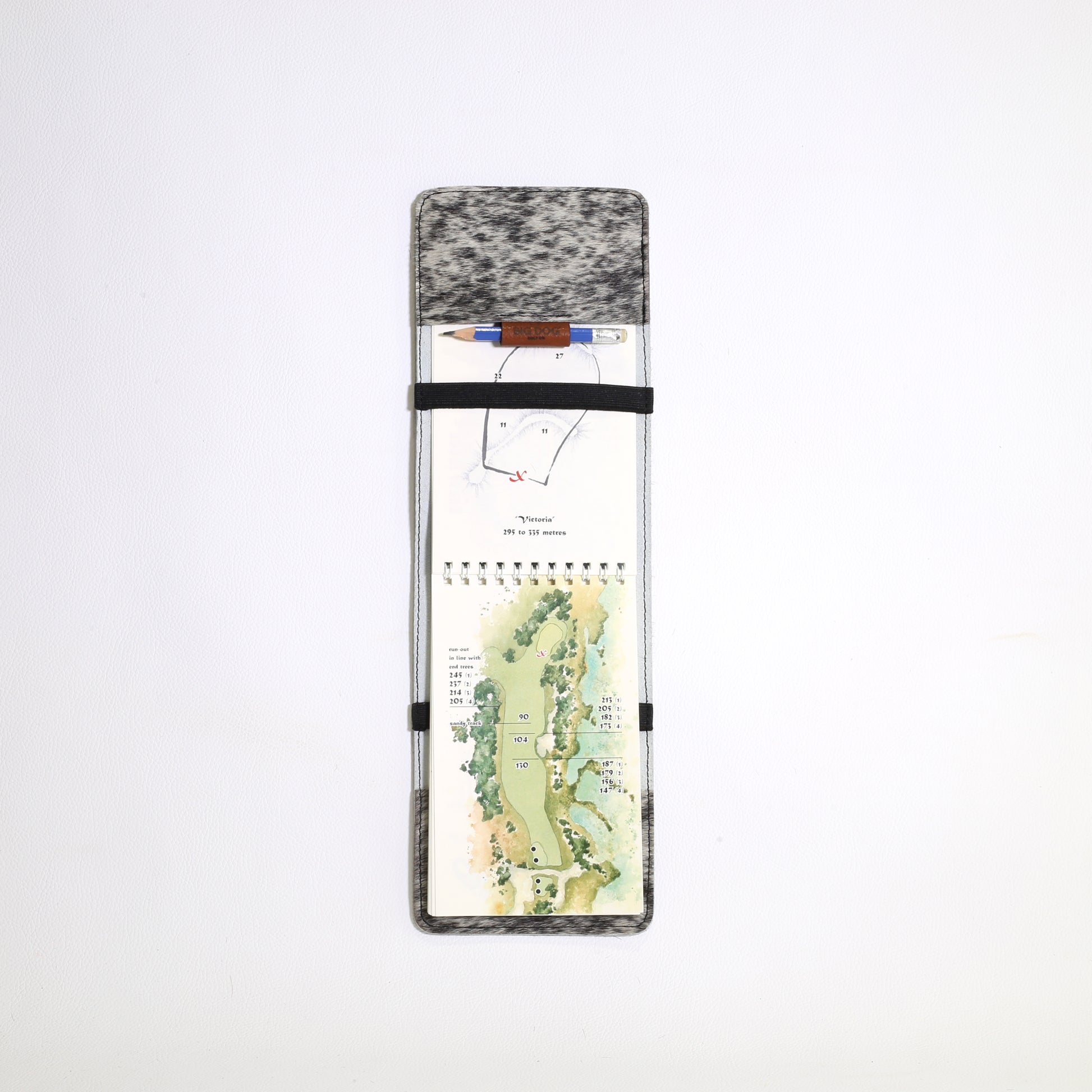 Premium leather yardage book covers featuring Salt & Pepper or Brindle hair on hide leather.