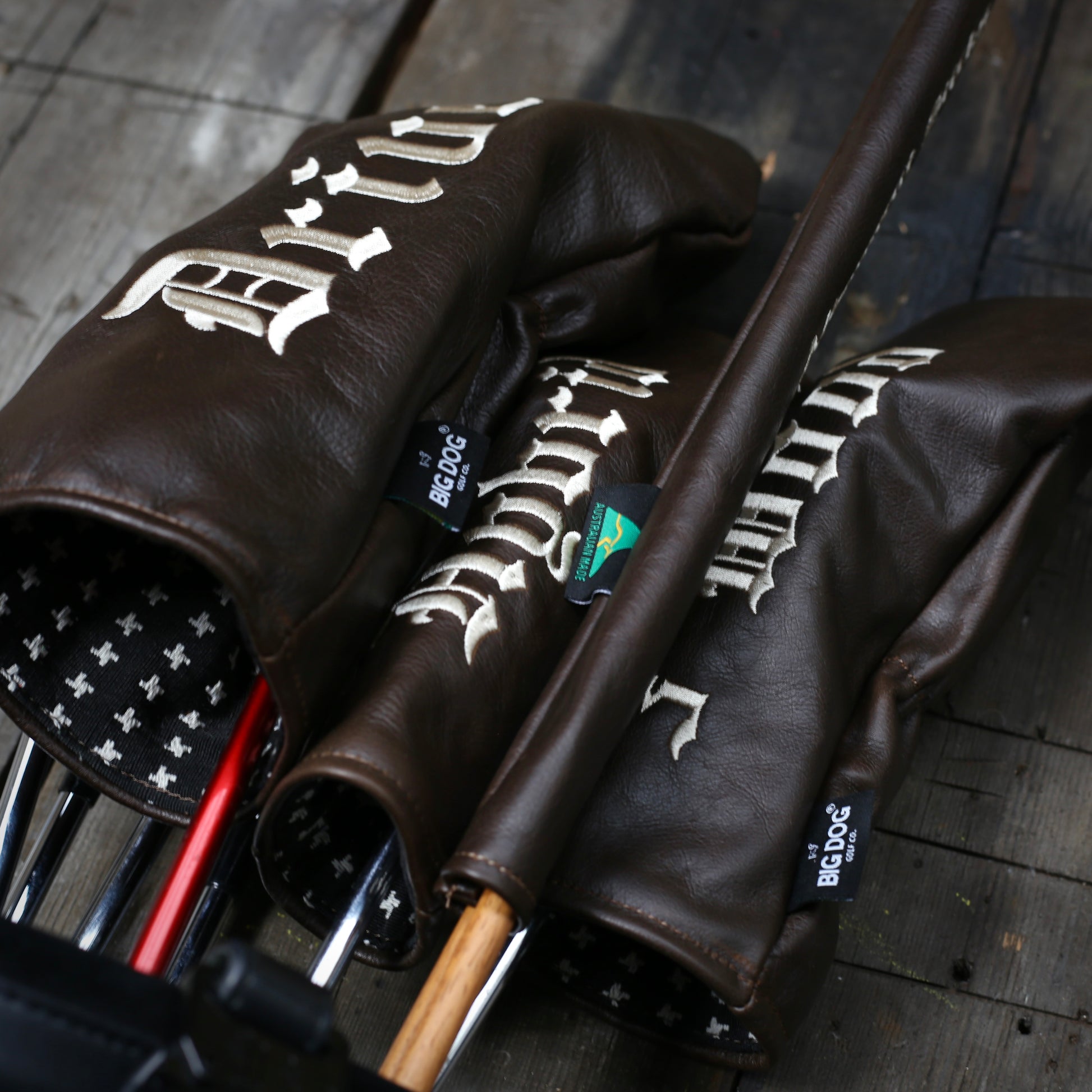 Details include off-white Old English script and a unique cross pattern lining to keep you clubs well protected. Dark brown italian full grain leather.